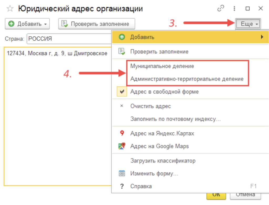 Шаг 3: Юридический адрес должен быть заполнен из классификатора с использованием муниципального или административно-территориального деления. В случае несоответствий адрес необходимо перезаполнить, выбрав нужные значения из классификатора: