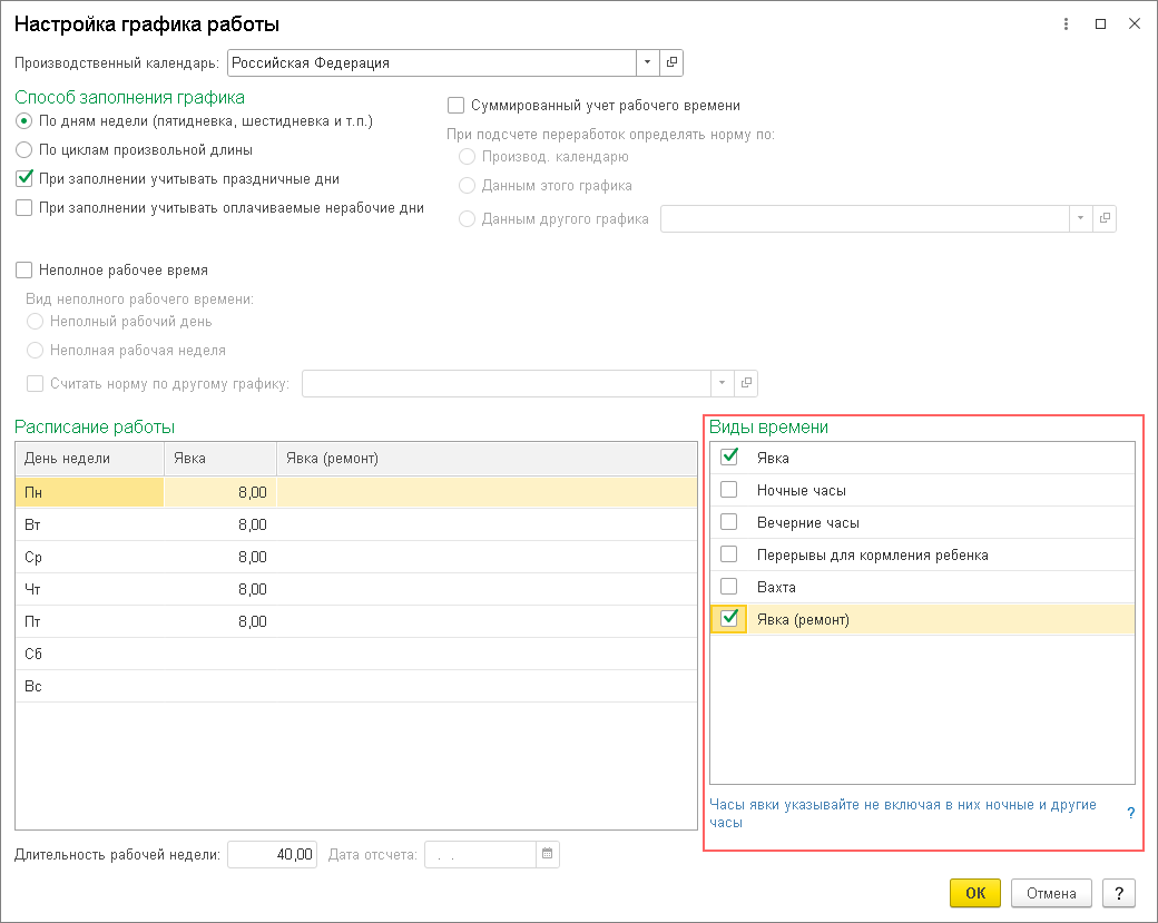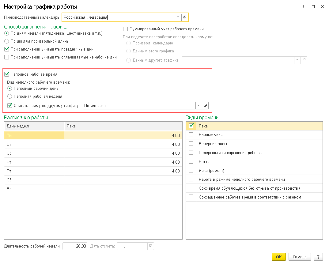Обратите внимание! Флажок Неполное рабочее время, переключатели Неполный рабочий день, Неполная рабочая неделя и флажок Считать норму по другому графику будут доступны в форме Настройка графика работы, если в форме настройки кадрового учета (раздел Настройка - Кадровый учет) установлен флажок Используется работа по неполной ставке. В разделе Виды времени будут доступны для выбора виды времени, соответствующие неполному рабочему времени.