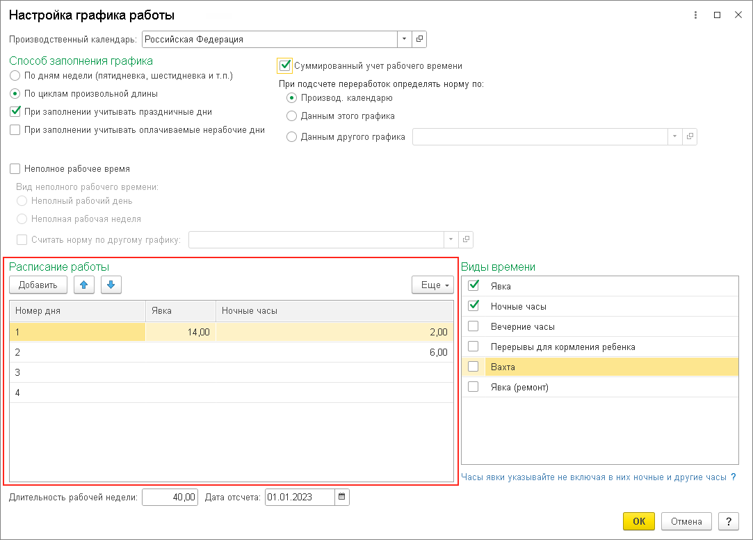 Для сменных графиков длительность рабочей недели автоматически не подсчитывается, поэтому данное поле при необходимости редактируется вручную (указывается еженедельная продолжительность рабочего времени, исходя из которой определяется нормальное количество рабочих часов за учетный период). При суммированном учете рабочего времени норма рабочего времени определяется за определенный учетный период (месяц, квартал и т.д., но не более календарного года). Соблюдение нормы рабочего времени за установленный учетный период для графиков суммированного учета в программе автоматически не контролируется, контроль над данными показателями возлагается на пользователя.