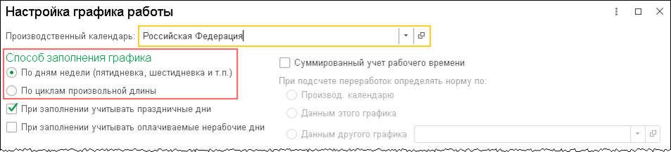 1. Выбора производственного календаря в поле Производственный календарь, которое становится доступным, если на предприятии предусмотрено несколько производственных календарей (рис. 3). Это может понадобиться для организаций, подразделения или филиалы которых расположены в регионах со своими собственными праздничными днями (для таких регионов норма дней не совпадает с общероссийским производственным календарем).