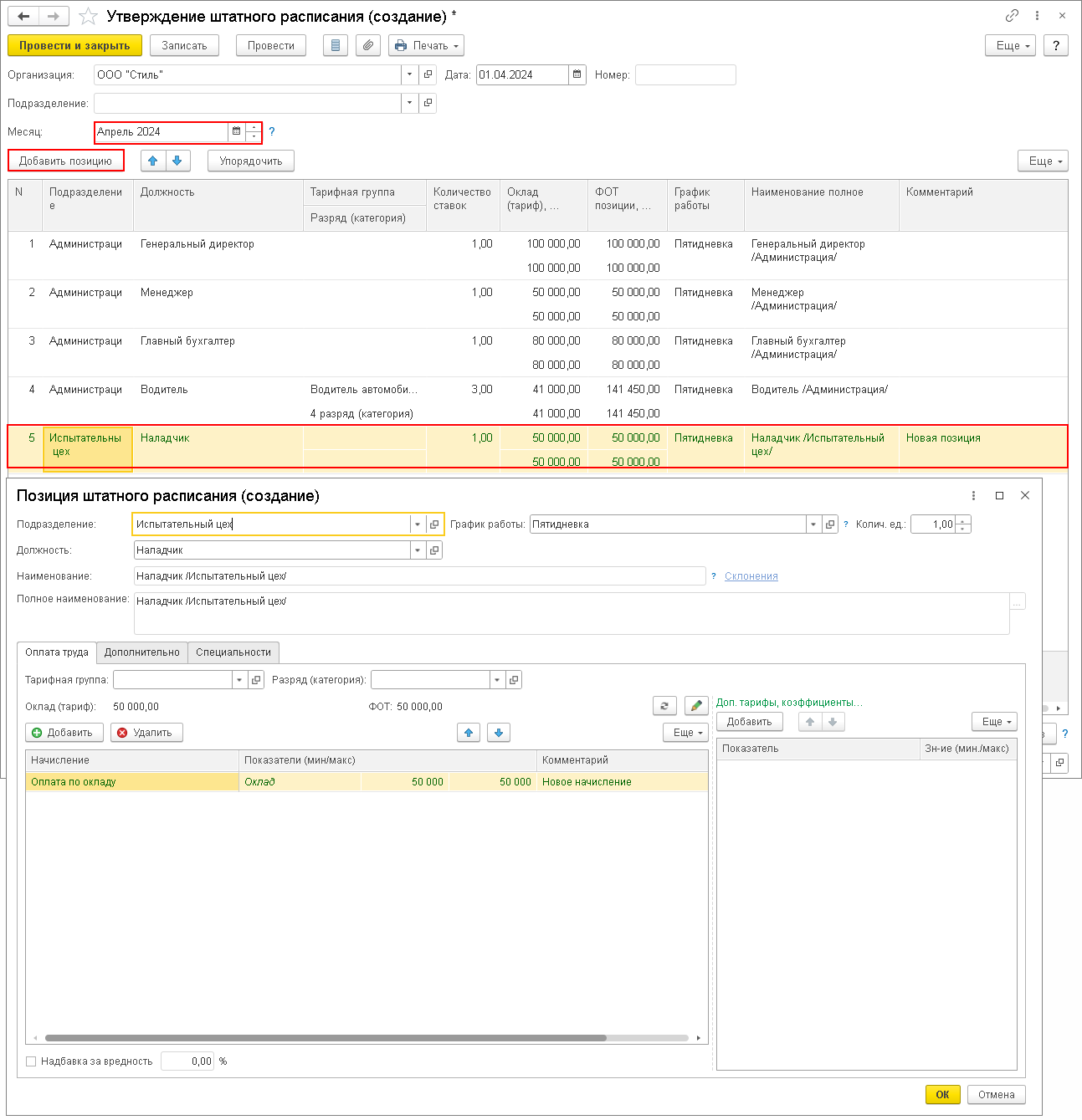 - новые позиции добавляются непосредственно в справочник Штатное расписание;