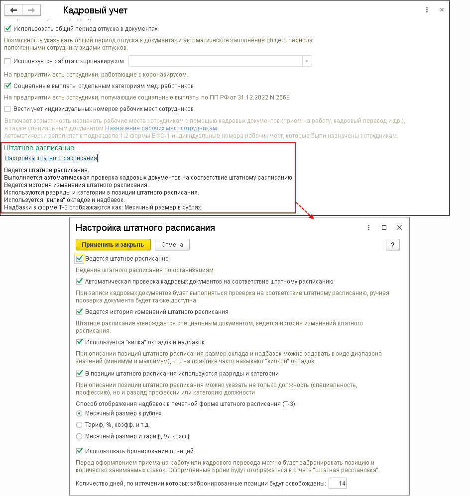 - флажок Использовать бронирование позиций установите для возможности бронирования позиций штатного расписания и количества занимаемых ставок перед оформлением приема на работу или кадрового перевода. Оформленные брони будут отображаться в отчете Штатная расстановка. Причем количество дней, по истечении которых забронированные позиции будут выделены в отчете красным цветом, можно указать в одноименном поле.