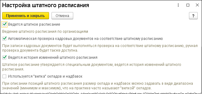Если история изменений штатного расписания не ведется (флажок Ведется история изменений штатного расписания снят):