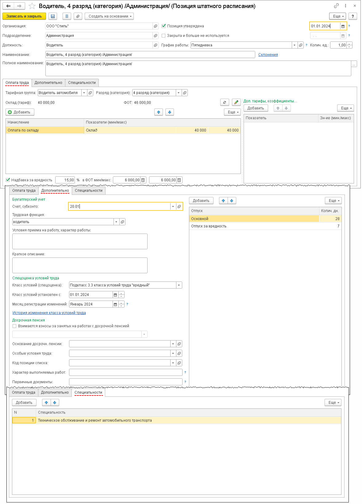 Если работа в одном и том же подразделении организации на одной и той же должности одного разряда (категории) может выполняться на разных условиях, то в штатном расписании можно описать разные соответствующие позиции. Подразделение, должность и разряд (категория) в них будут одинаковые, а условия труда – разные.