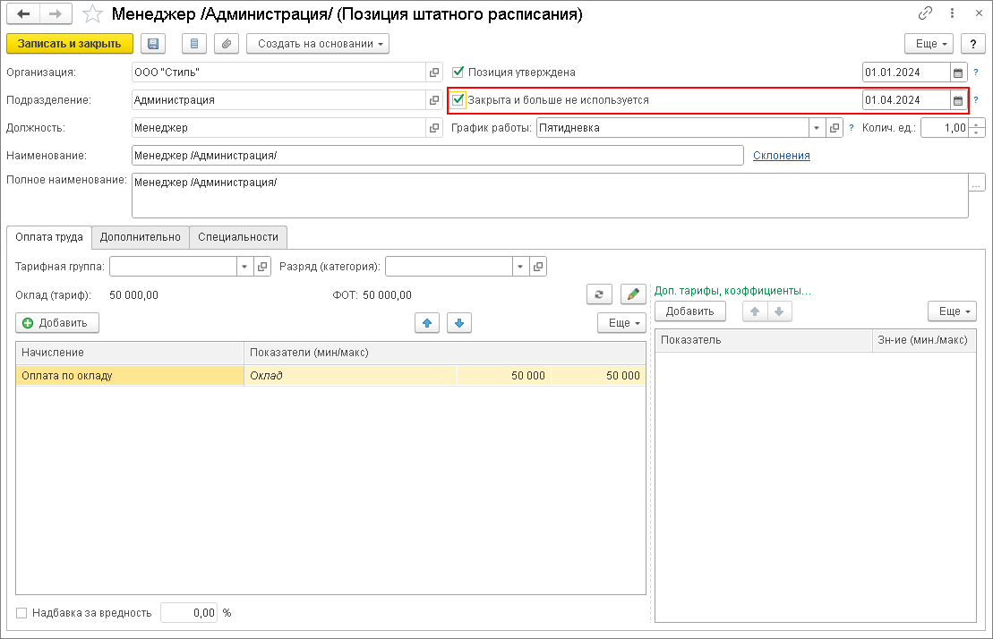 - Флажок Закрыта и больше не используется устанавливается, когда необходимо закрыть штатную позицию.