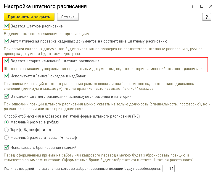 Порядок работы со штатным расписанием зависит от того, установлен или снят флажок Ведется история изменений штатного расписания в форме настройки штатного расписания.