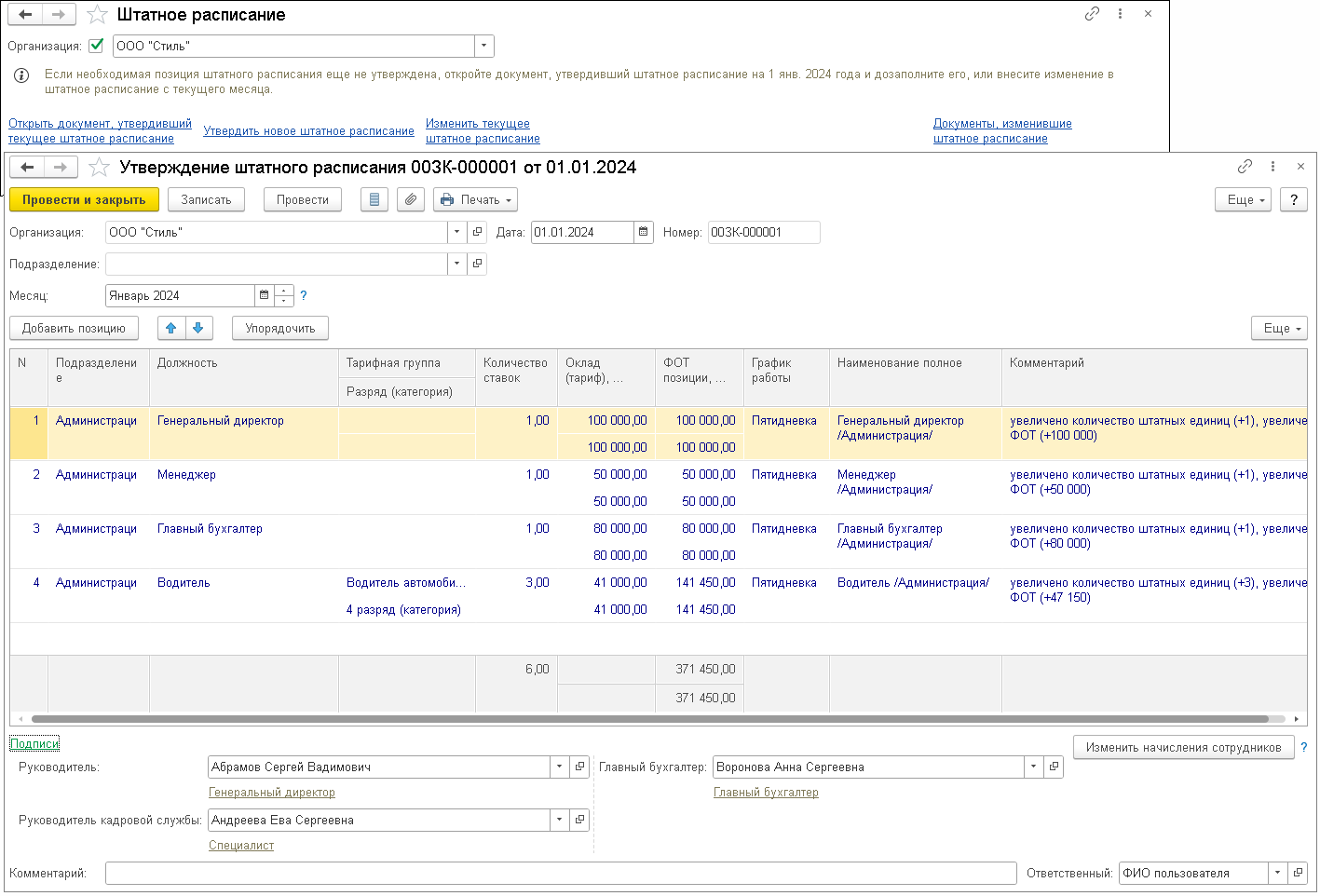 Ввод и изменения штатного расписания
