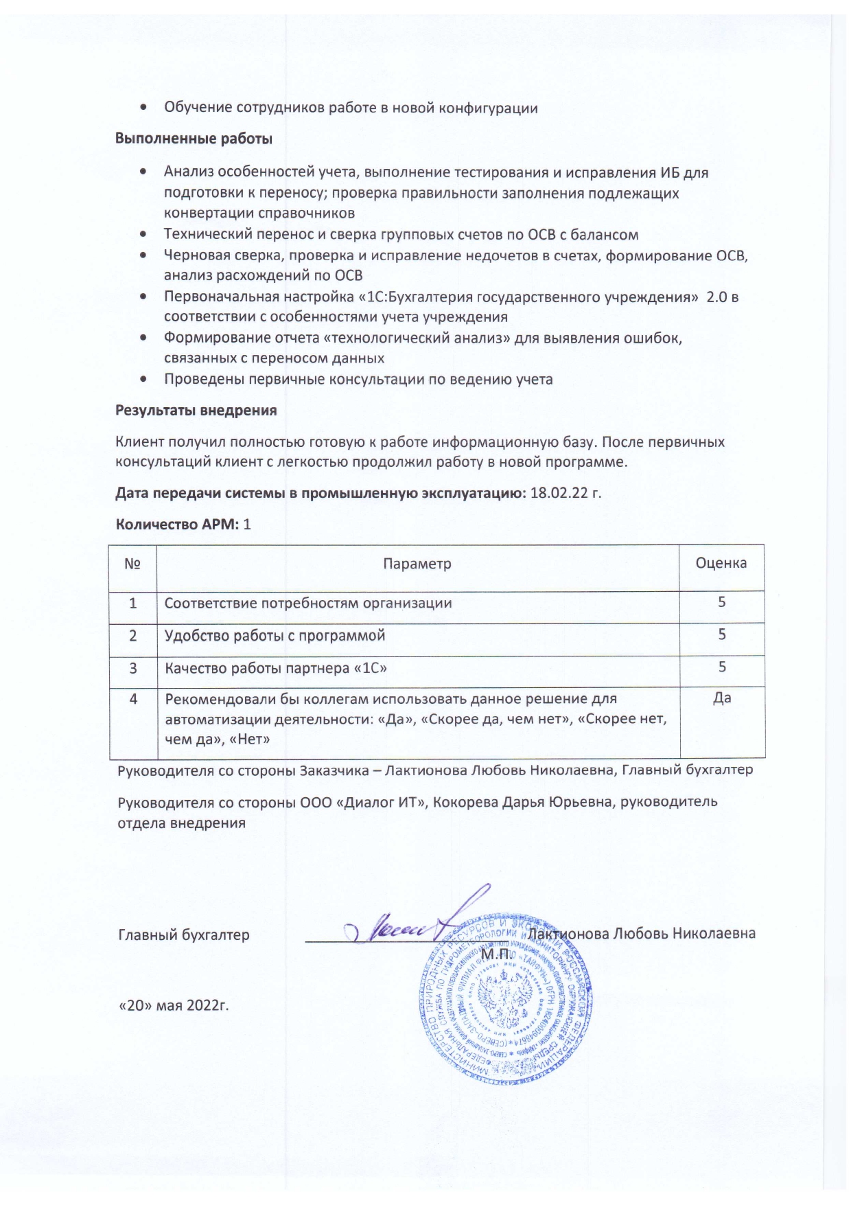 Клиент получил полностью готовую к работе информационную базу. После первичных консультаций клиент с легкостью продолжил работу в новой программе.