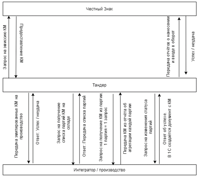 На этапе передачи КМ в ПО интегратора для последующего нанесения их на продукцию и при получении нанесенных КМ от ПО интегратора задействуются следующие изменения:
