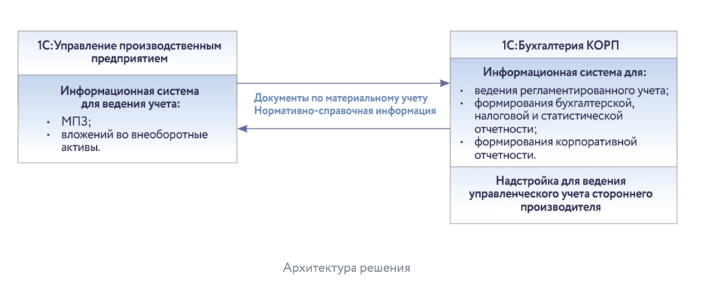 Для построения единой системы бухгалтерского, управленческого и налогового учета выбраны программные продукты: «1С:Управление производственным предприятием», «1С:Бухгалтерия КОРП» и программа для автоматизации процессов управления на предприятии, управления финансами, планирования и бюджетирования стороннего производителя.